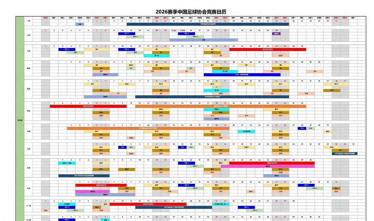 2026赛季的中超赛程安排看起来比现在合理多了。 新赛季从2026年3月6日开始,11月8日结束,总跨度达9个月。 中甲和中乙联赛则分别于3月14日和3月21日开赛。