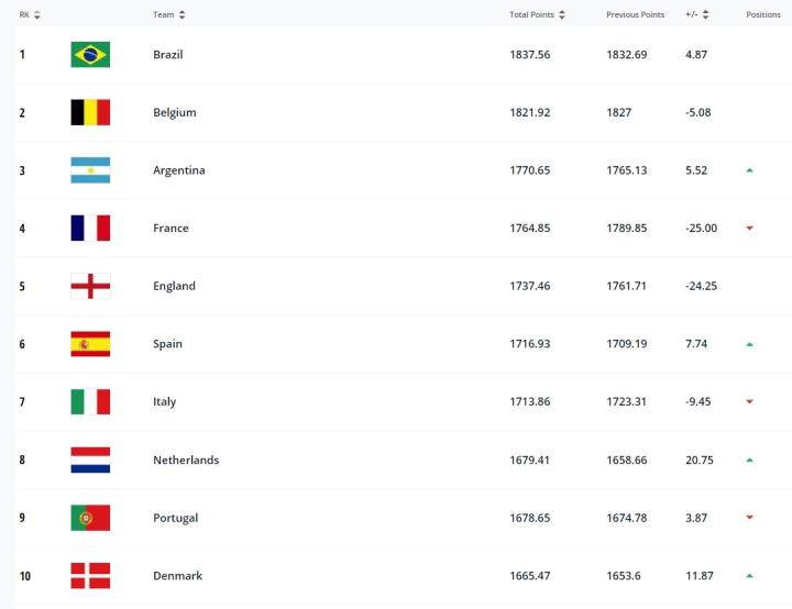 世界前十:巴西、比利时、阿根廷、法国、英格兰、西班牙、意大利、荷兰、葡萄牙、丹麦。