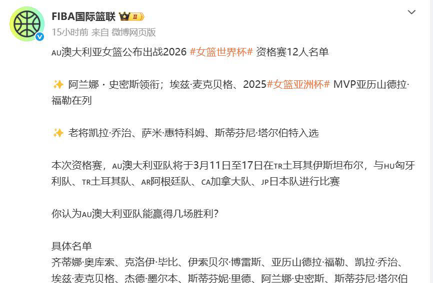 相比之下,澳大利亚女篮作为中国的传统劲敌,早在一个月前就公布了确认参赛的12人名单。过去几年里,澳大利亚凭借夺得亚洲杯冠军的辉煌战绩,整体实力屹立亚洲篮坛巅峰,其阵容深厚实力无人能及。此次名单由经验丰富的阿兰娜·史密斯领衔,麦克贝格、福乐等多名顶尖球员悉数入选,尤其是福乐,她不仅是去年亚洲杯的MVP,更是球队攻防核心。其余入选的还有齐蒂娜·奥库索、克洛伊·毕比、伊索贝尔·博雷斯、凯拉·乔治、杰德·墨尔本、斯蒂芬妮·里德、斯蒂芬尼·塔尔伯特、萨米·惠特科姆以及阿莱士·威尔逊。这样一支豪华阵容,将使澳大利亚在世预赛上大概率顺利拿下世界杯资格。